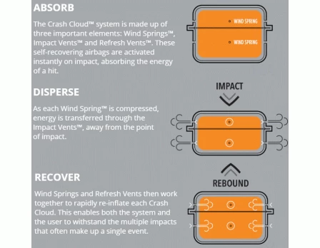 Protection: Windpact’s Crash Cloud™ technology uses an air bladder system to amplify impact protection without sacrificing performance, comfort & style. Extensive testing shows that Windpact padding disperses energy more effectively than traditional padding. The technology has a series of crash clouds, refresh vents, and wind springs that instantly absorb and disperse impacts.