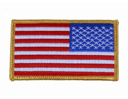 Embroidered United States flag patch for referee or umpire uniforms – generally for use on right sleeve- is 3.5″ by 2.25″. Choose American flag with white or gold border.